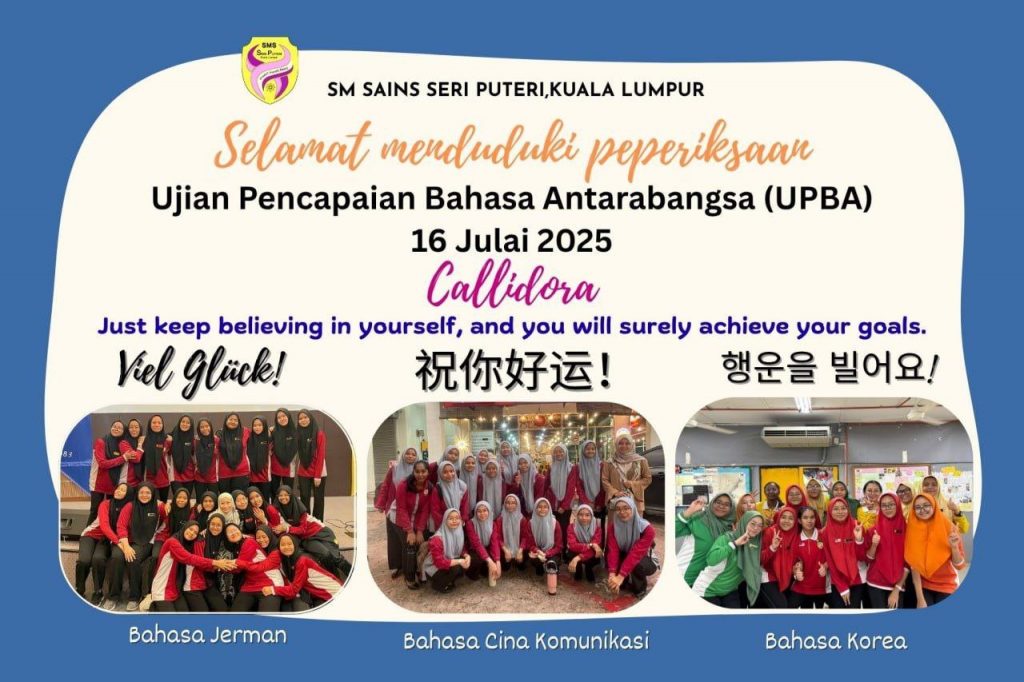 Selamat menempuh Ujian Pencapaian Bahasa Antarabangsa utk puteri-puteri Callidora. Semoga diberikan kelapangan hati dan ketenangan jiwa dalam menghadapi peperiksaan dan semoga usaha keras membuahkan kejayaan yang cemerlang.